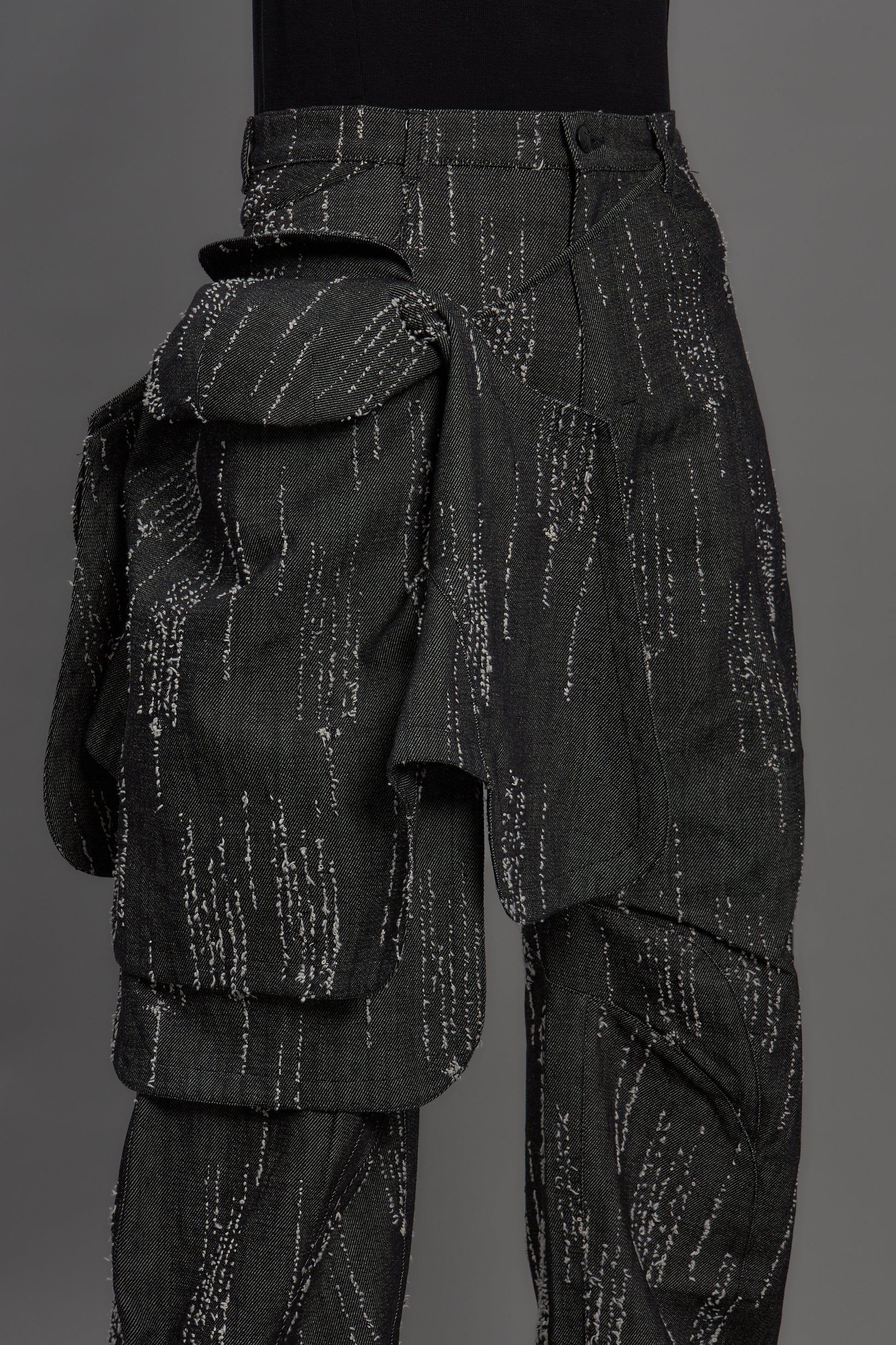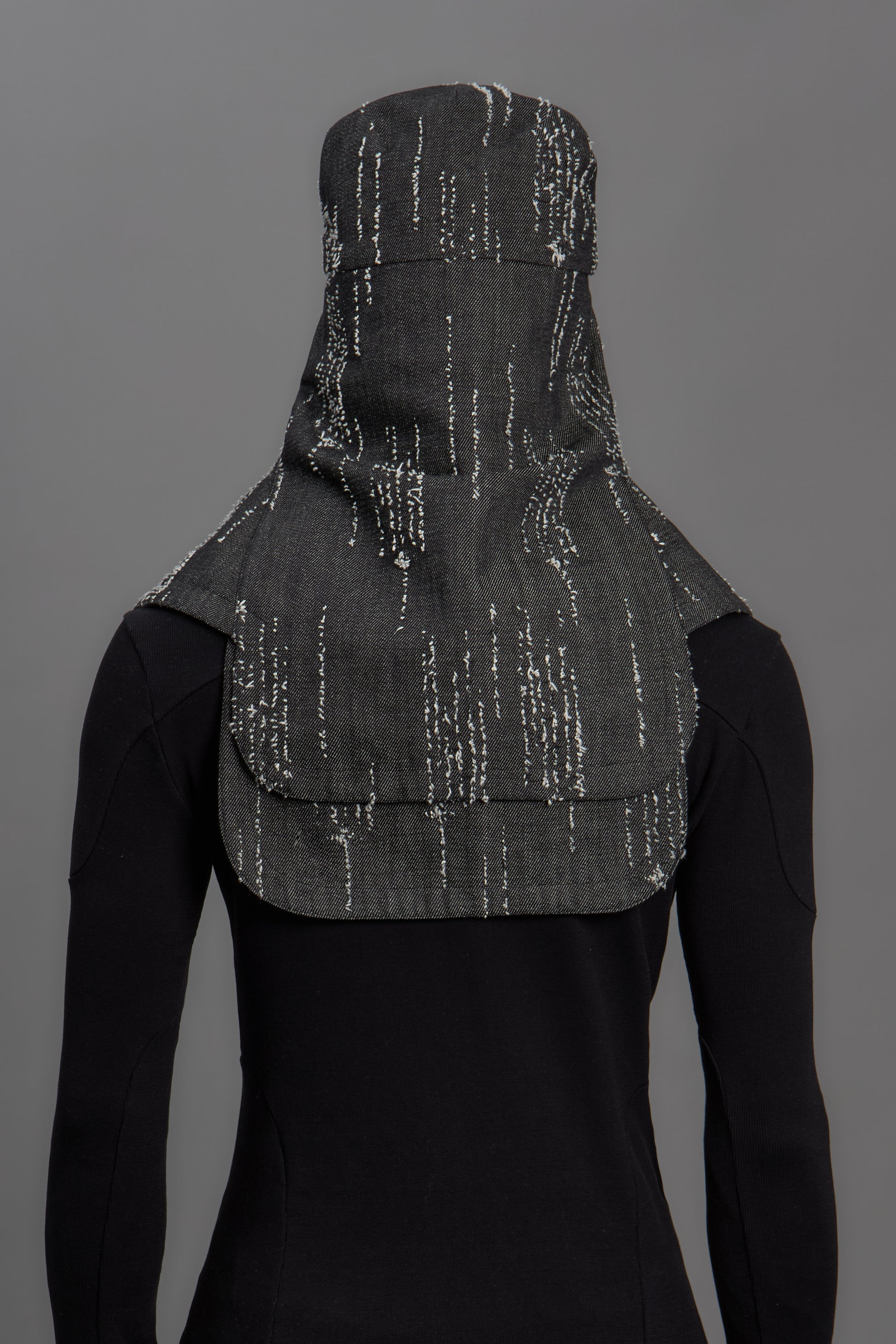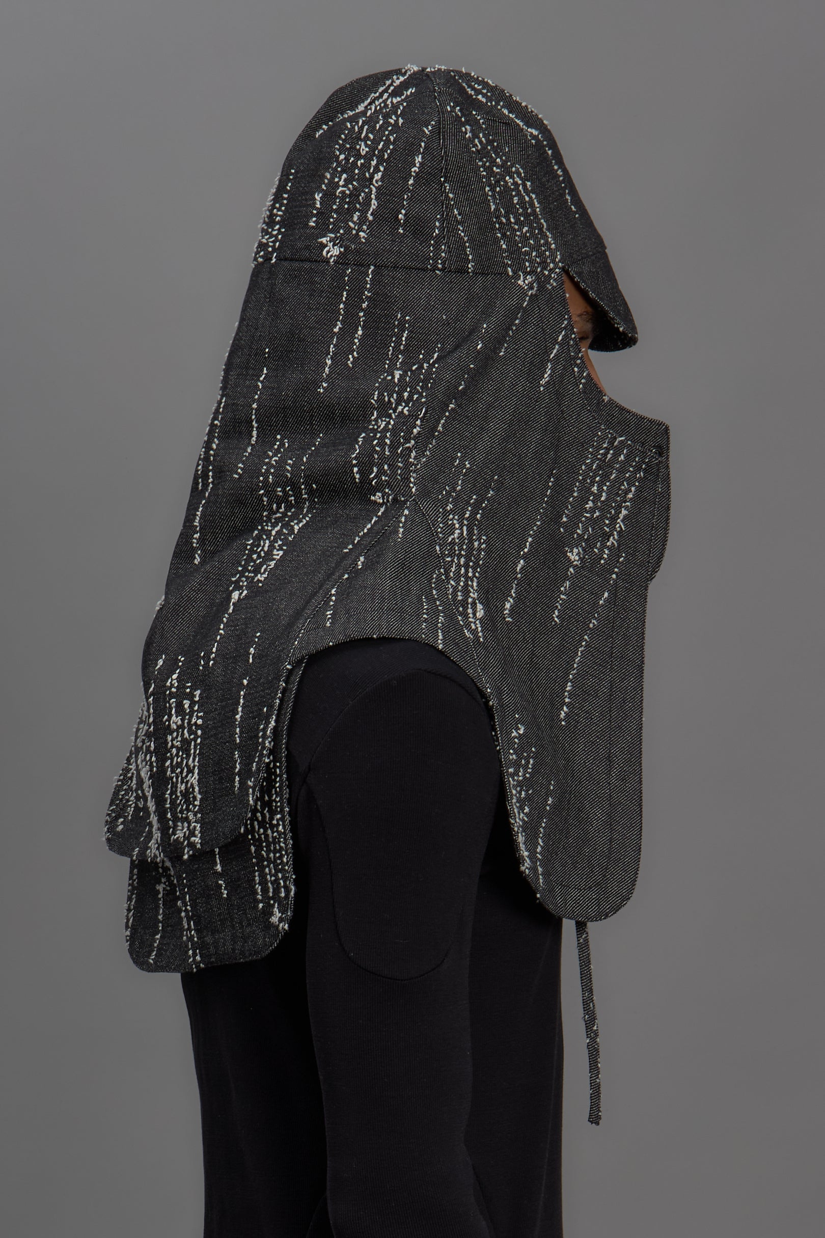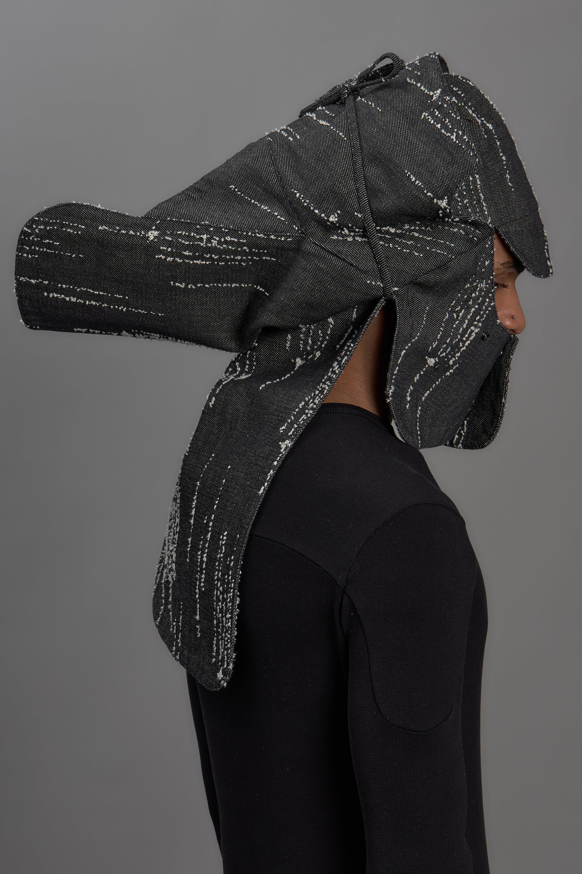 Multi-layered Falling Stars Italian Denim composition w/ face cover, snap buttons closure and boonie ties.