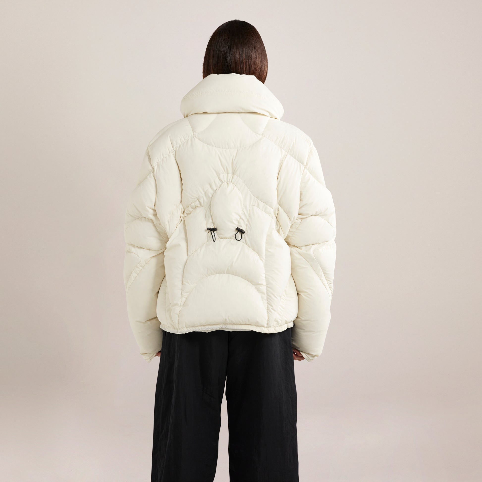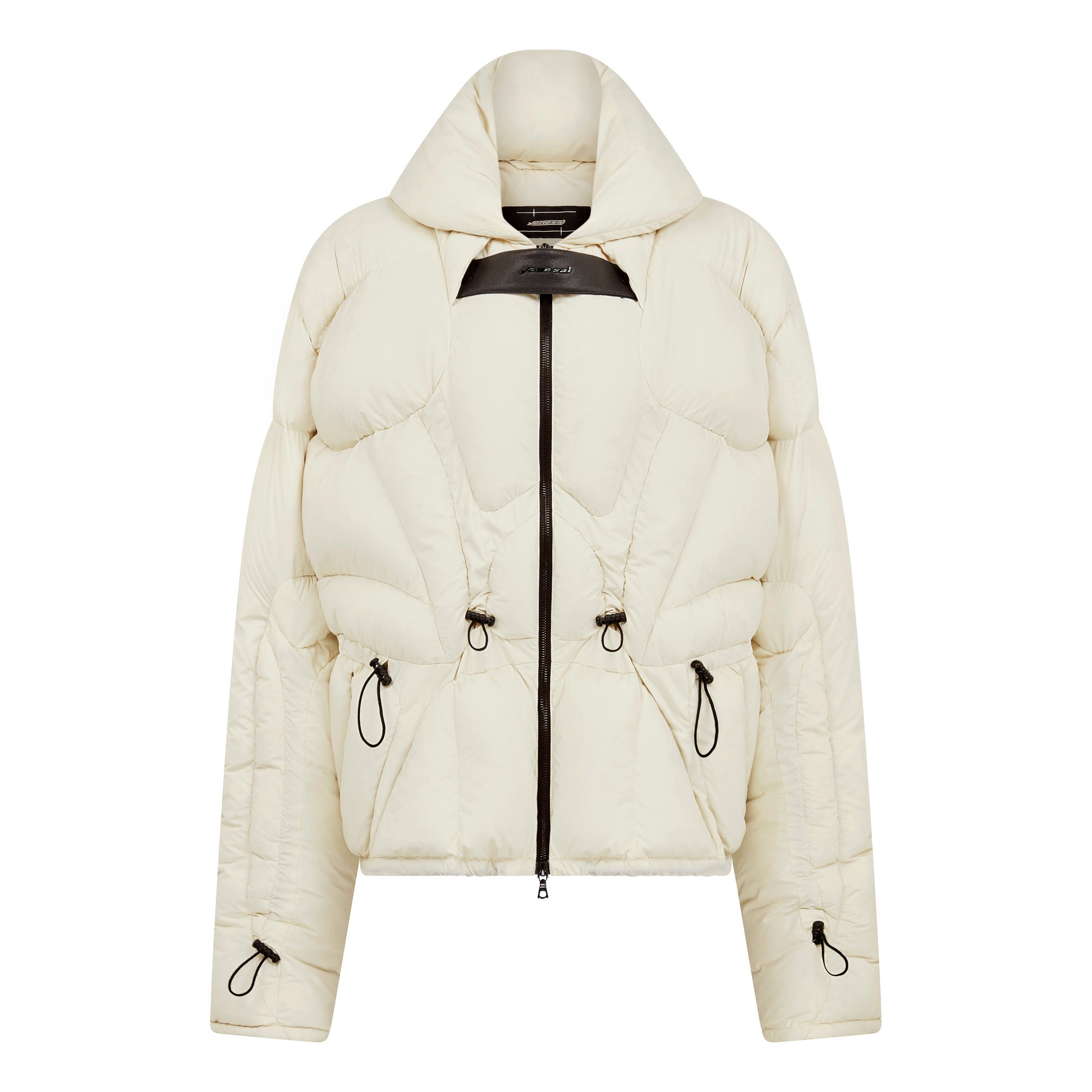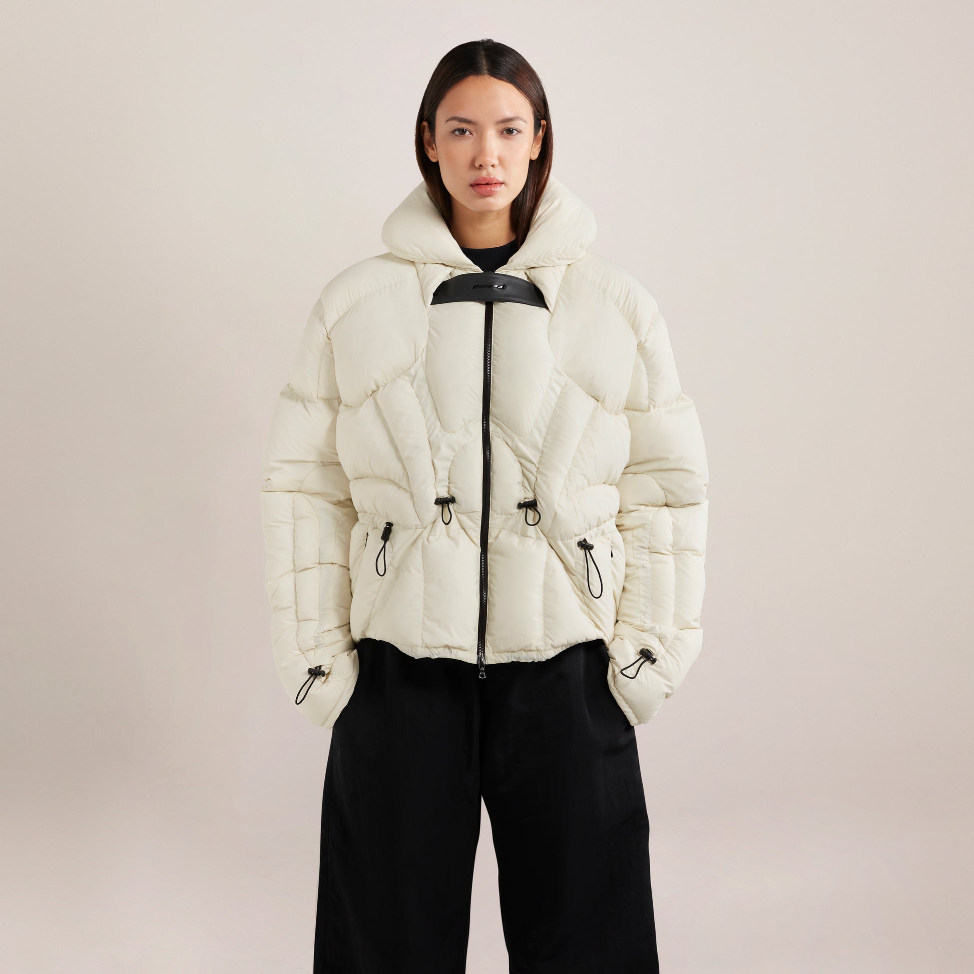 PROMETHEUS Coat, with panels and shapes reimagined from muscles on the human body. Features 10 adjustable drawcords for the ultimate, customisable fit. Made of water repellent Japanese nylon and filled with 100% goose down for extra warmth.