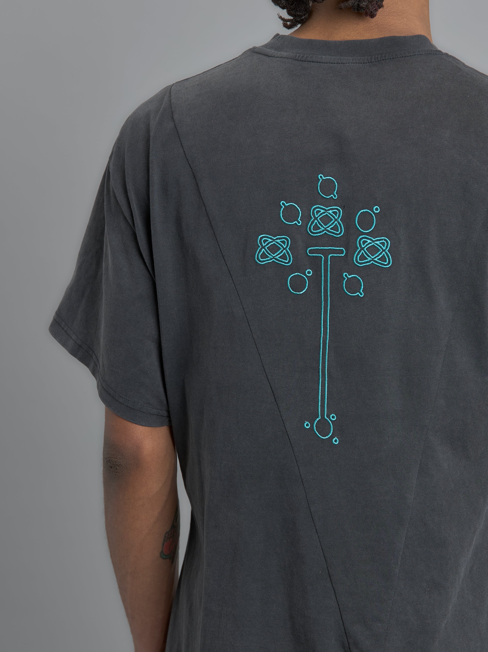 Upcycled from a previous collection, with added embroidery and asymmetrical drape