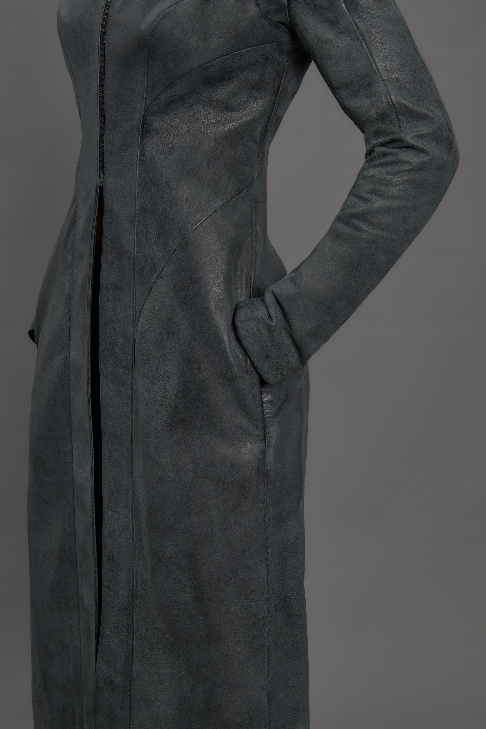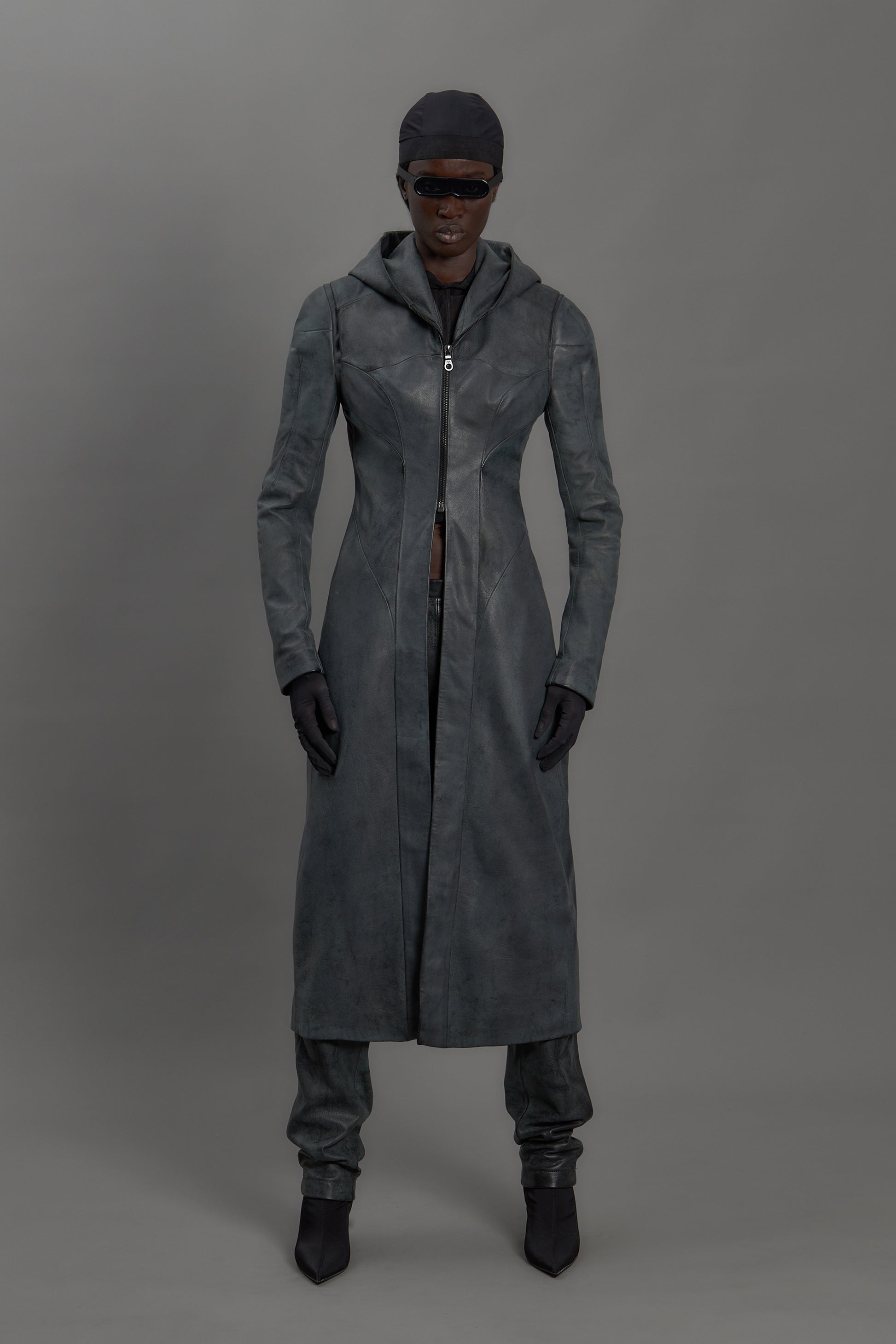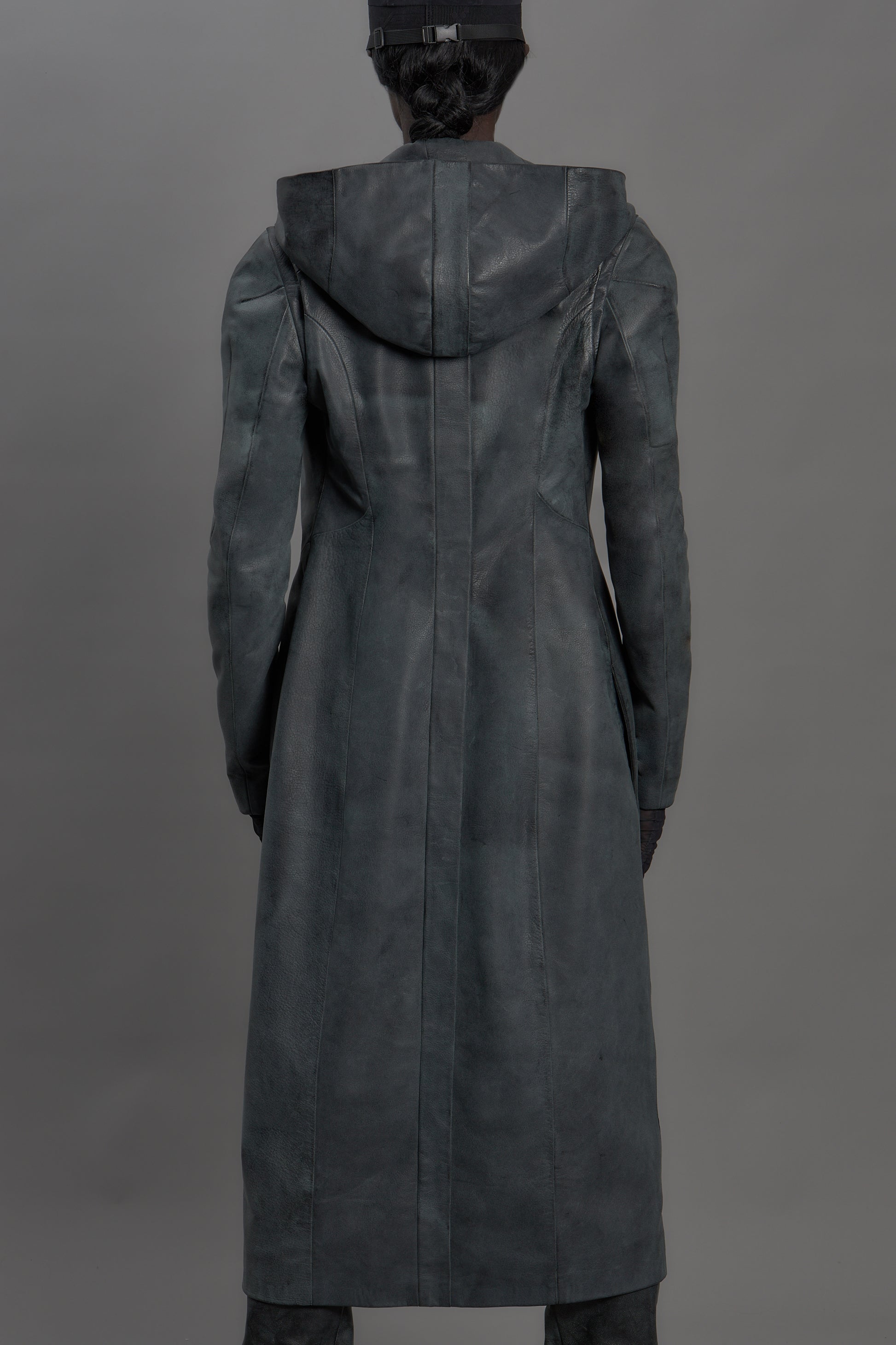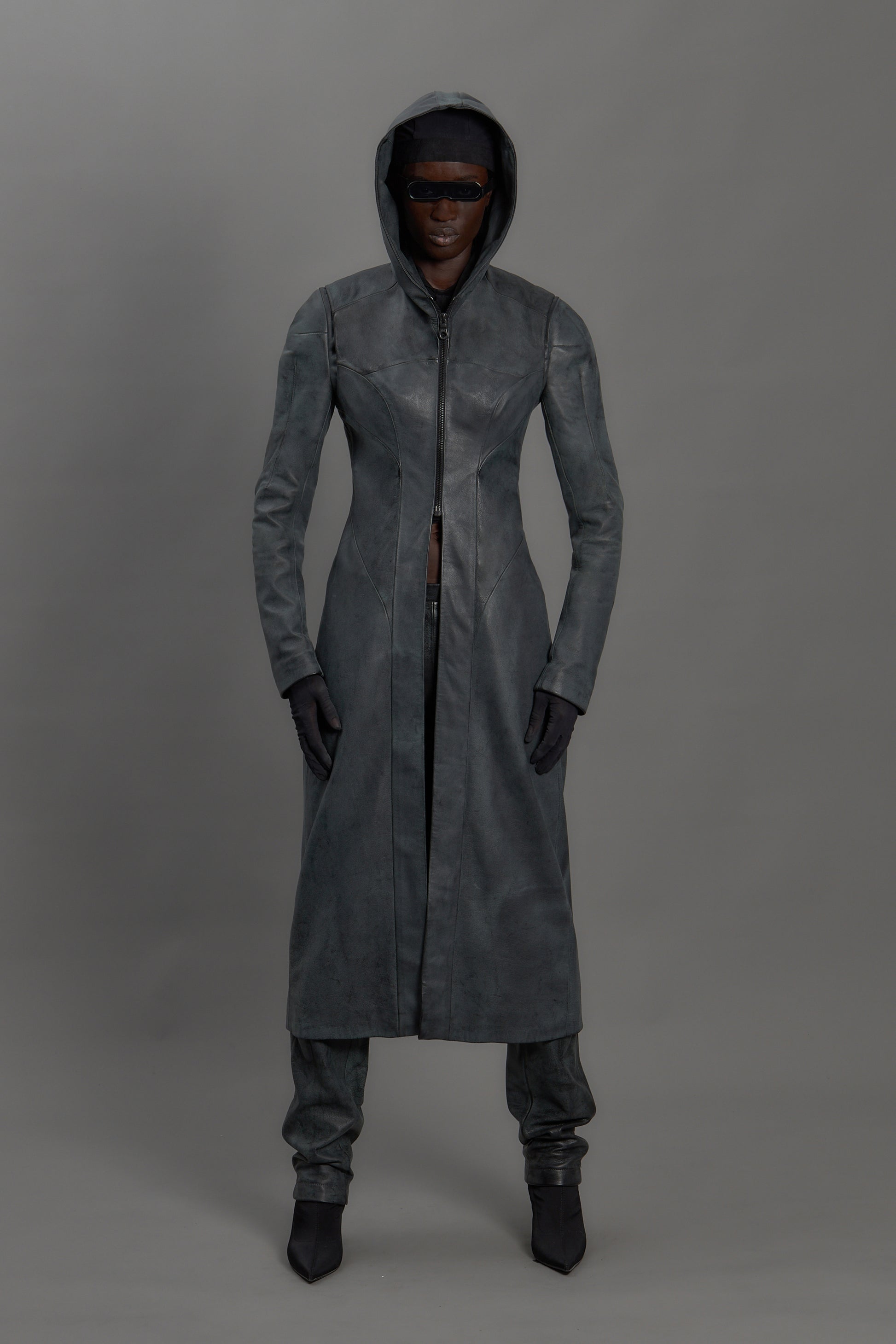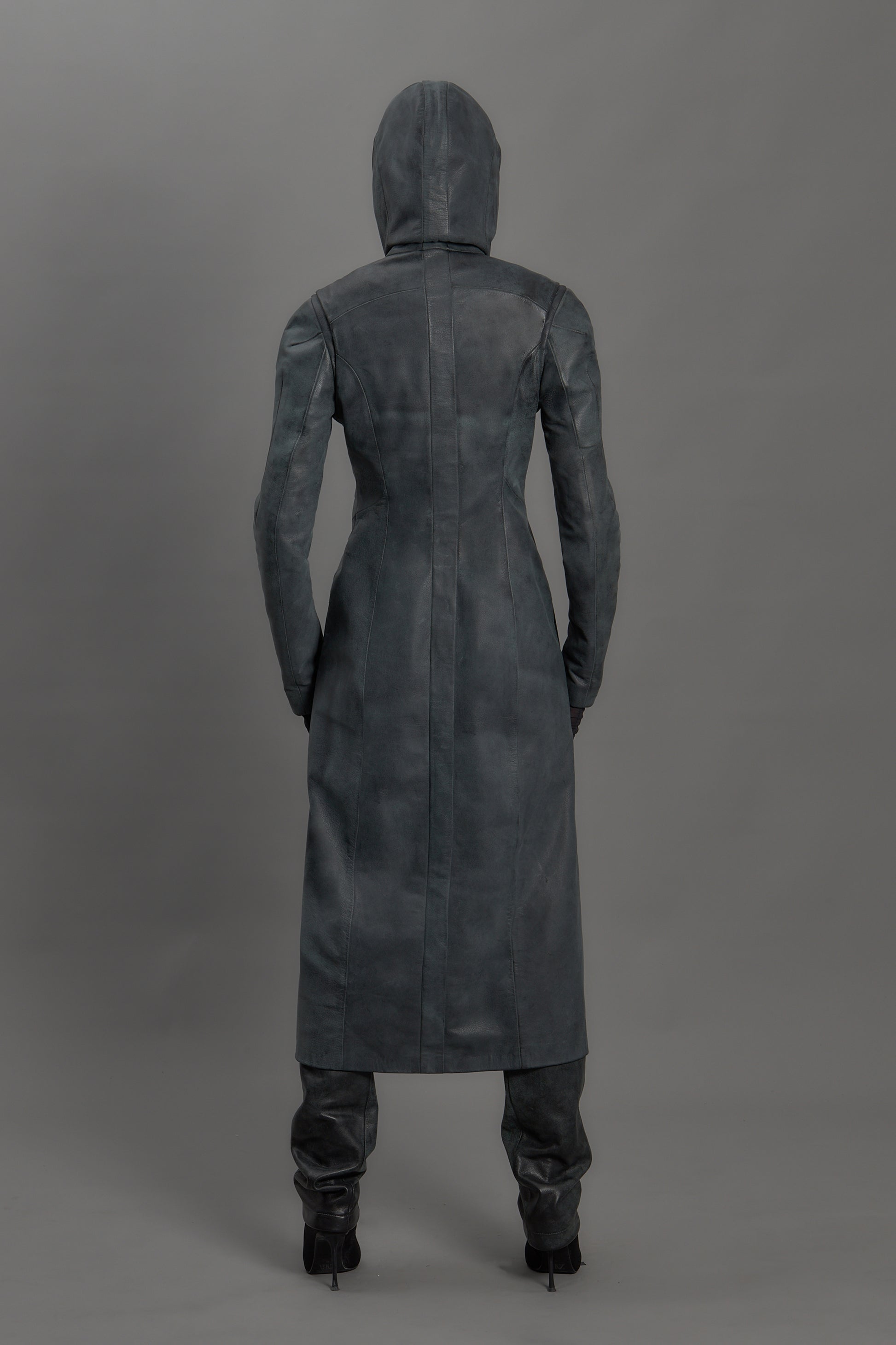 Full length leather trench coat with hood.